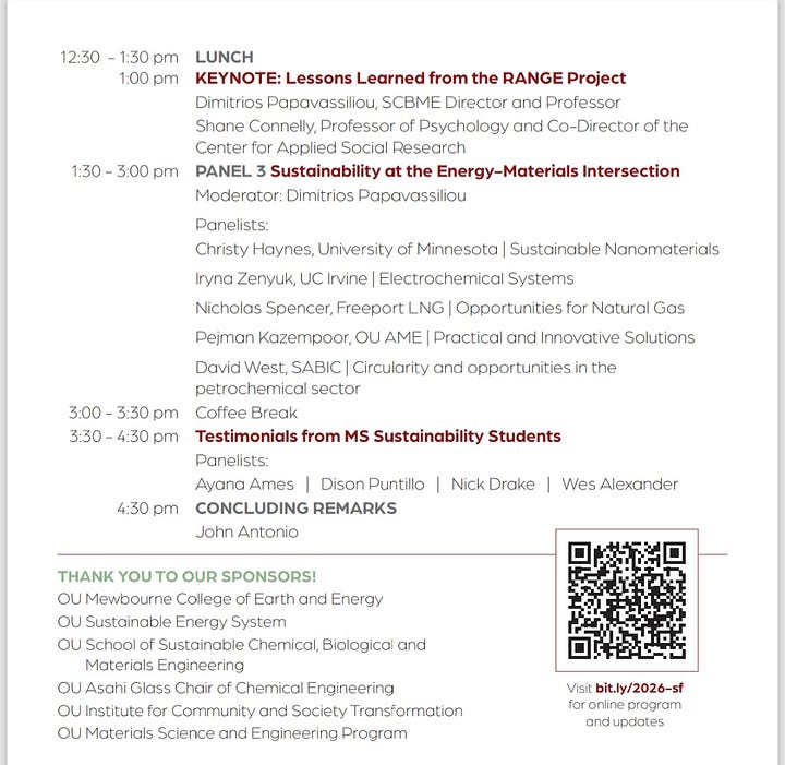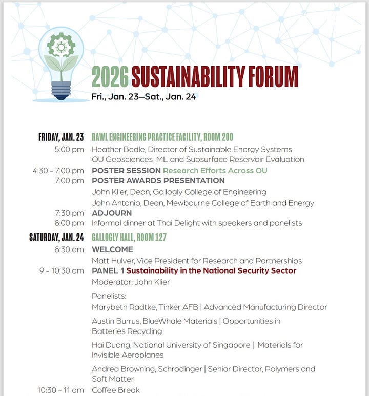 Originally, I was planning to head up to Norman, OK for The University of Oklahoma’s Sustainability Forum that was being held on Saturday. Well the whole event got moved to being virtual due to the snow storm and it was a great call. Sadly for me, that meant I would be stuck in my hotel room for 3 days in Dallas. However, I still had a great time attending the event virtually and had the pleasure of speaking with my fellow classmates on a panel about how the program has helped us in our career paths and why we selected the program. It was a packed forum with experts speaking on data center and AI energy consumption, land use and water capacities for agriculture, and the use of nanoparticles in various ways including how to help fight hunger. It was an honor to share the “room” with such incredible people.